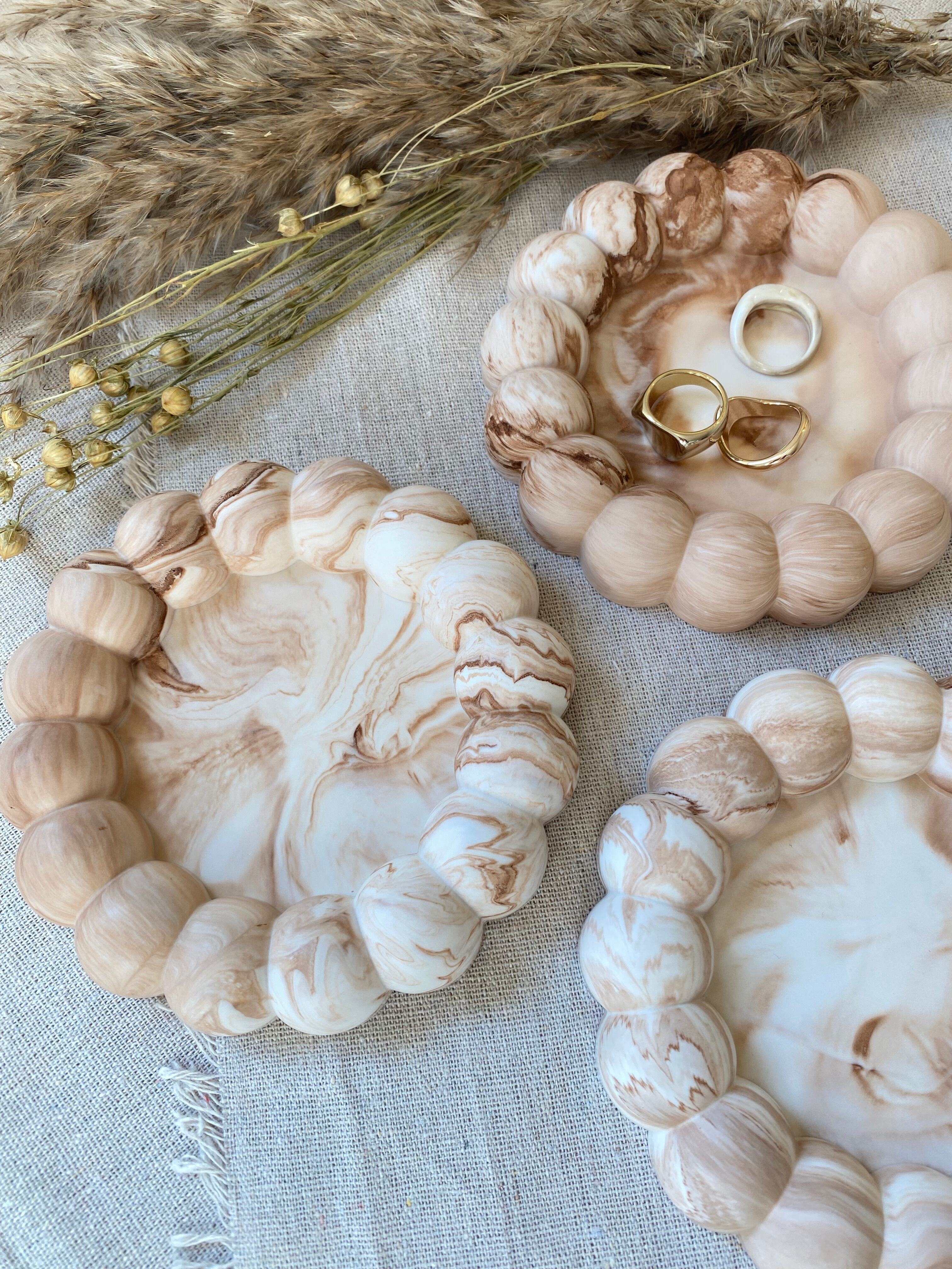 まるでCafe latteのように、淡く柔らかに混ざり合う模様が特徴のトレイで、アクセサリーやコスメ、小物類を置くのに丁度いいサイズ感です。